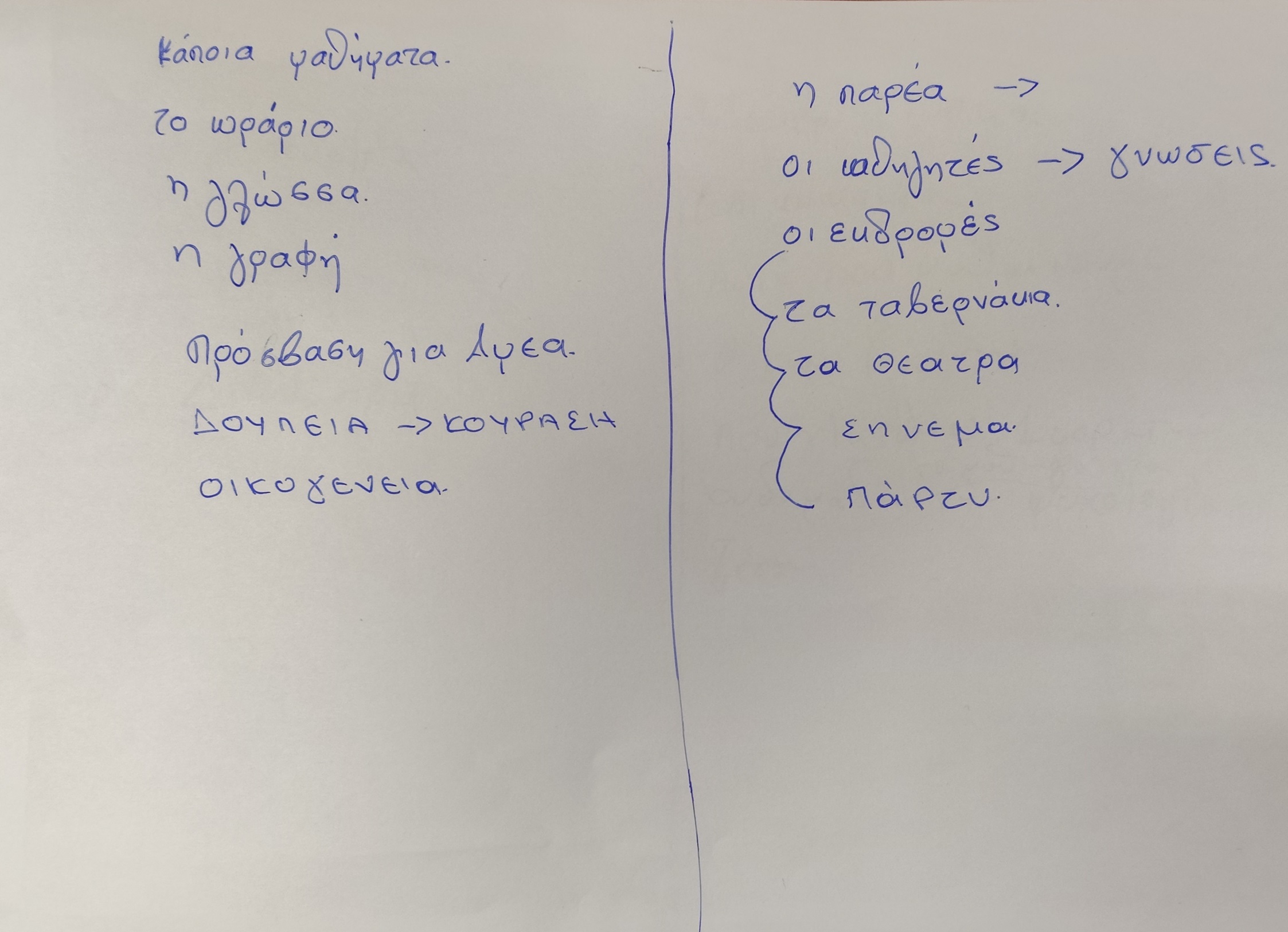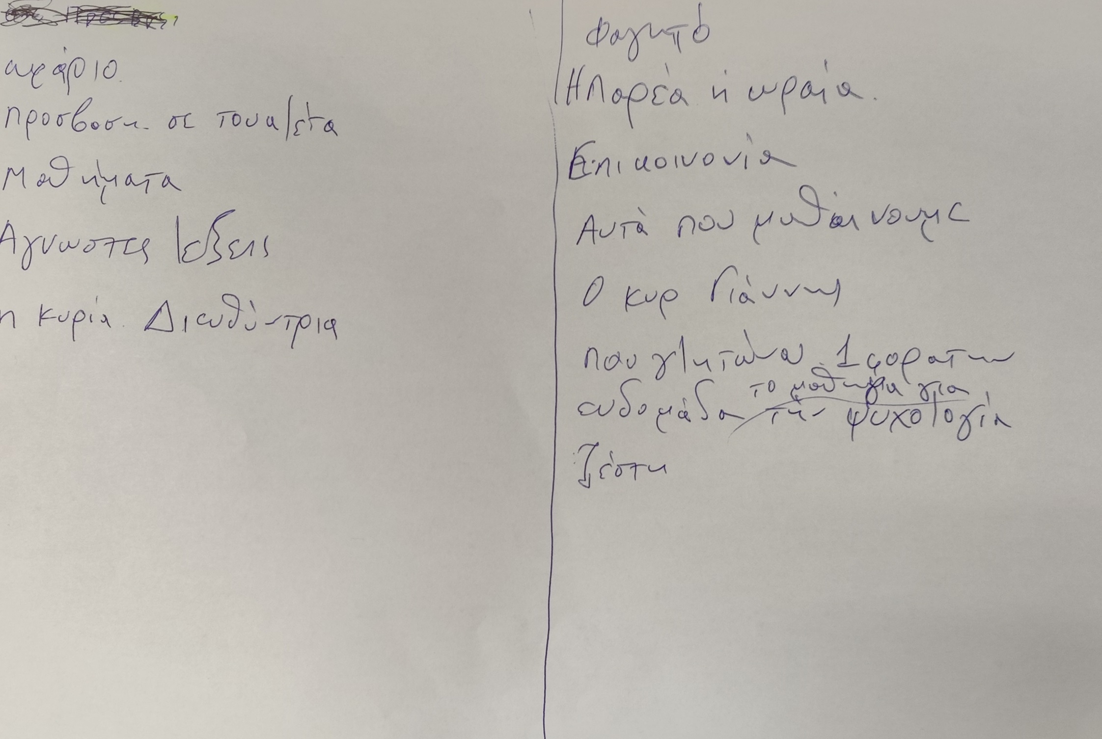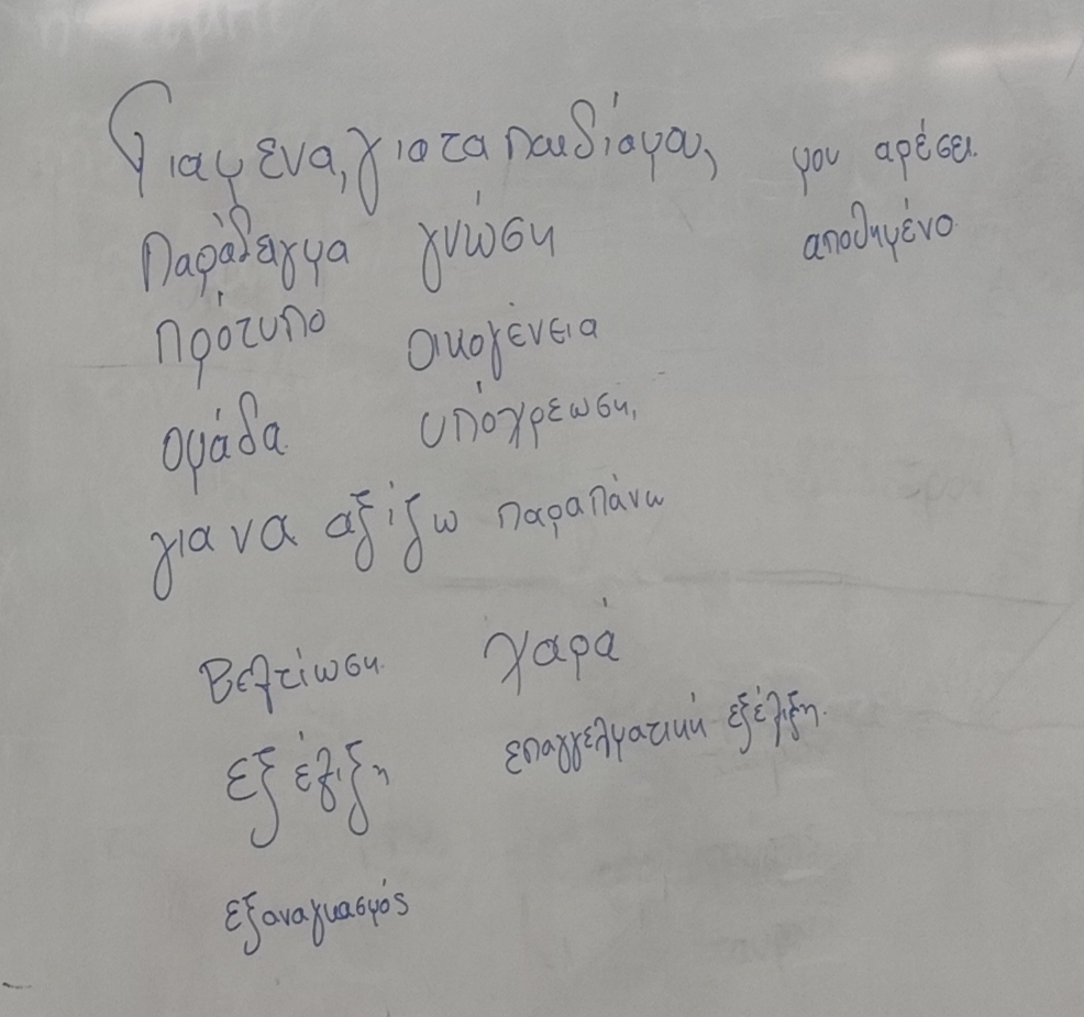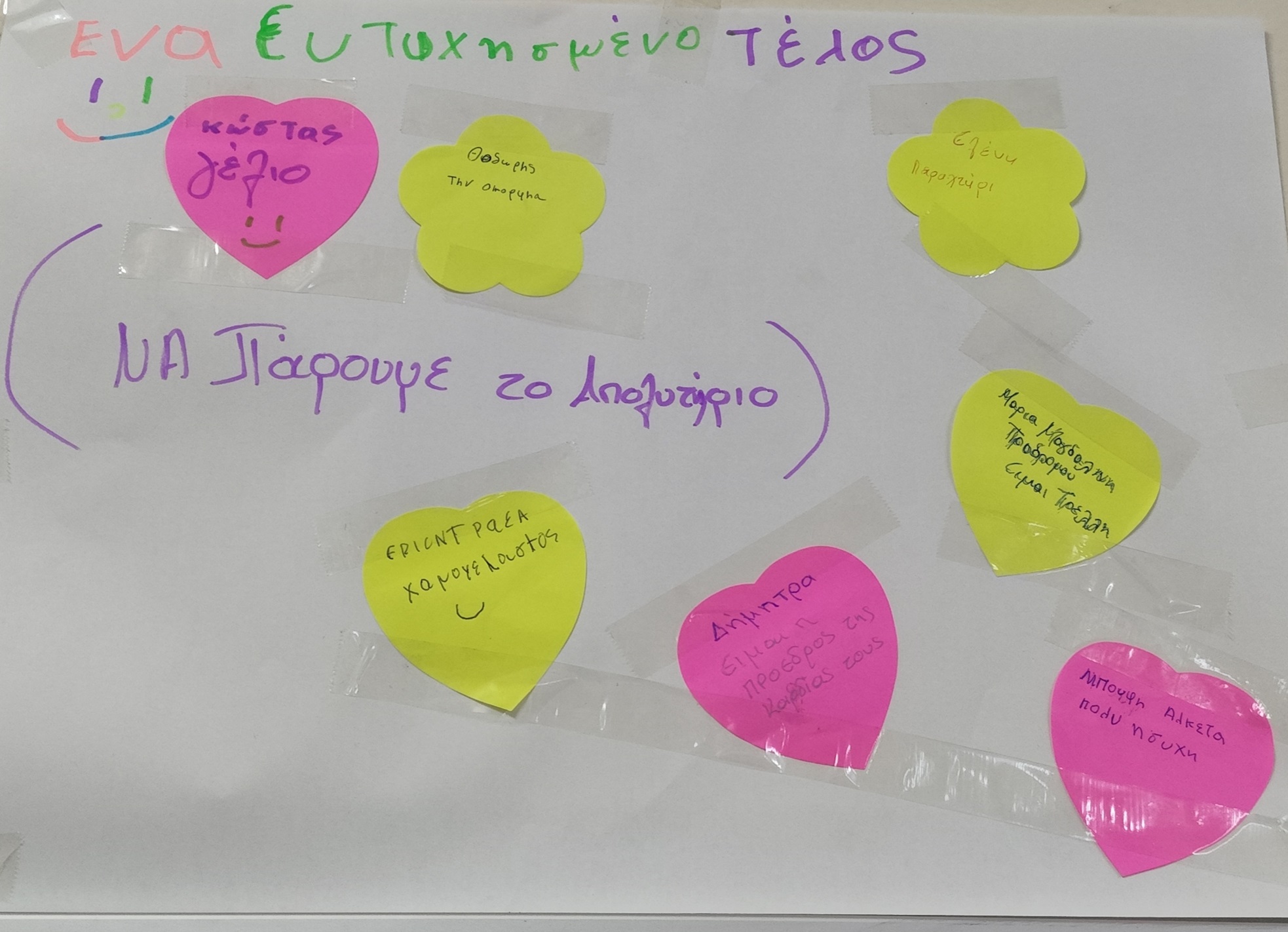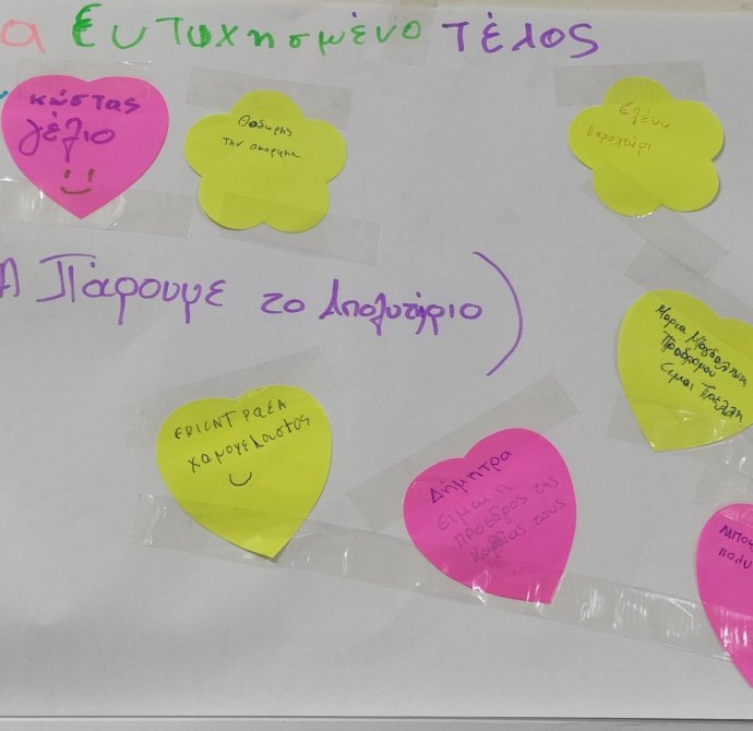 - Παρακολούθηση δράσης που έγινε από την ψυχολόγο του σχολείου σε τάξη του σχολείου. Η δράση είχε σαν σκοπό την ενίσχυση των ενηλικών μαθητών για επίτευξη των στόχων τους και την ενδυνάμωση της αυτοεκτίμησης τους.